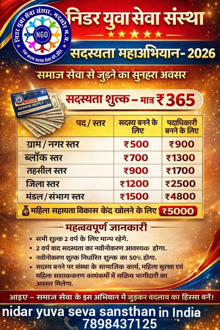 Nidar Yuva Seva Sanstha was established on 16 April 2018. The main objective of the organization is to empower women and free them from fear and work for the rights of women. To prevent juvenile crime and connect children to education and employment. To make people aware of cleanliness by running cleanliness awareness campaigns and organize camps. To reach the government schemes to the general public and to help the poor laborers, disabled and helpless people. Nidar Yuva Seva Sanstha worked in the field of women empowerment, health, employment and education and worked for the working class and environmental protection. The achievement of the organization is that hundreds of families were benefited by the organization. The team of Nidar Yuva Seva Sanstha remained active in Mandsaur Neemuch district and helped the flood victims and during the lockdown in the Corona period, dry ration was distributed to hundreds of families. Relief material and clothes were also sent to Shivpuri flood victims and the organization provided essential goods to many poor families and the needy. The workers of the organization supported the administration in Corona vaccination and helped people in getting vaccinated by setting up camps at some places. And made people aware about waxing. Health camps were also organized at many places regarding other diseases. With the help of all the workers, 70,000 saplings were planted by the organization in Mandsaur Neemuch district. The organization played an active role in getting women their rights and justice. A girl was given financial help to play national level sports. The organization also worked with the people of nomadic society and Basda community. Free coaching classes were also organized for education and linked with the government schemes to bring them into the mainstream of society. The organization worked with the working class people and made them aware of the government schemes and benefited many families. When the contractor did not pay the money of some laborers, their wages were given with the help of the administration. The organization is continuously working for the justice and rights of poor laborer women and children. And the organization also continuously provides its services in blood donation. Till now thousands of people have taken membership in the organization and people from Rajasthan, Bihar, Gujarat, Uttar Pradesh have expressed their desire to take membership. Nidar Yuva Seva Sanstha is starting the Bhiksha Mukt Bharat Abhiyan to end begging from India. Action is to be taken against those who make children beg with the help of the government. And by opening Bhiksha Varti Mukt Kendras for those children, they are to be connected to education. Our main aim is to bring the nomads and Vimukt Samaj into the mainstream of society by connecting them to the government schemes, for which the cooperation of the government administration and public participation is very important.