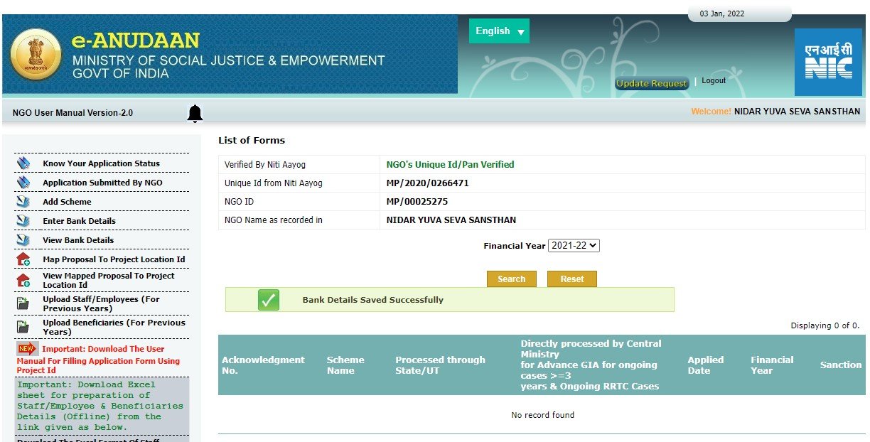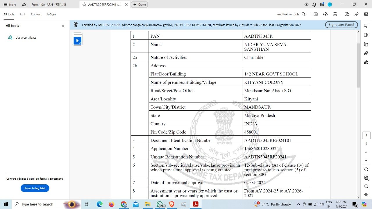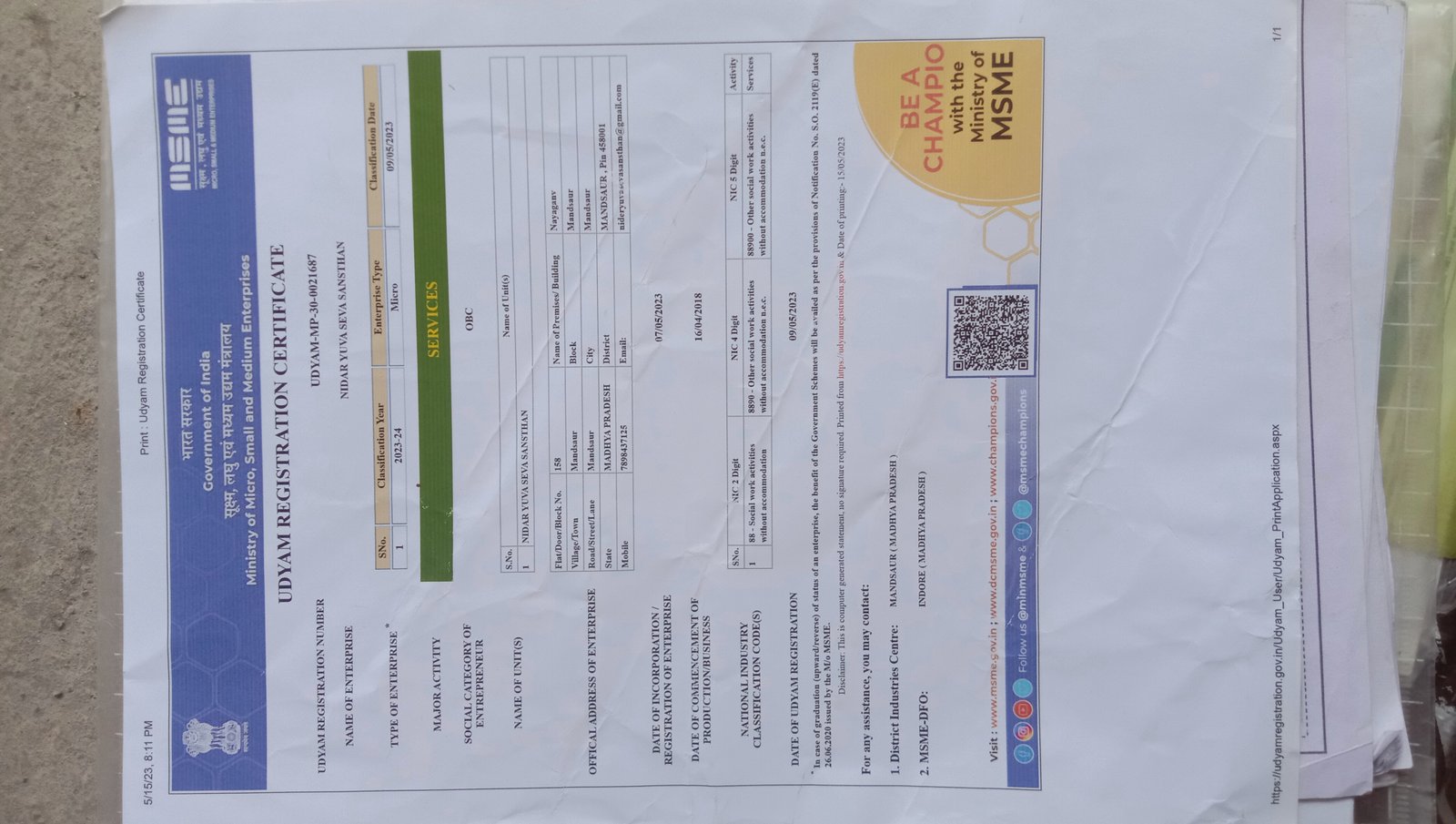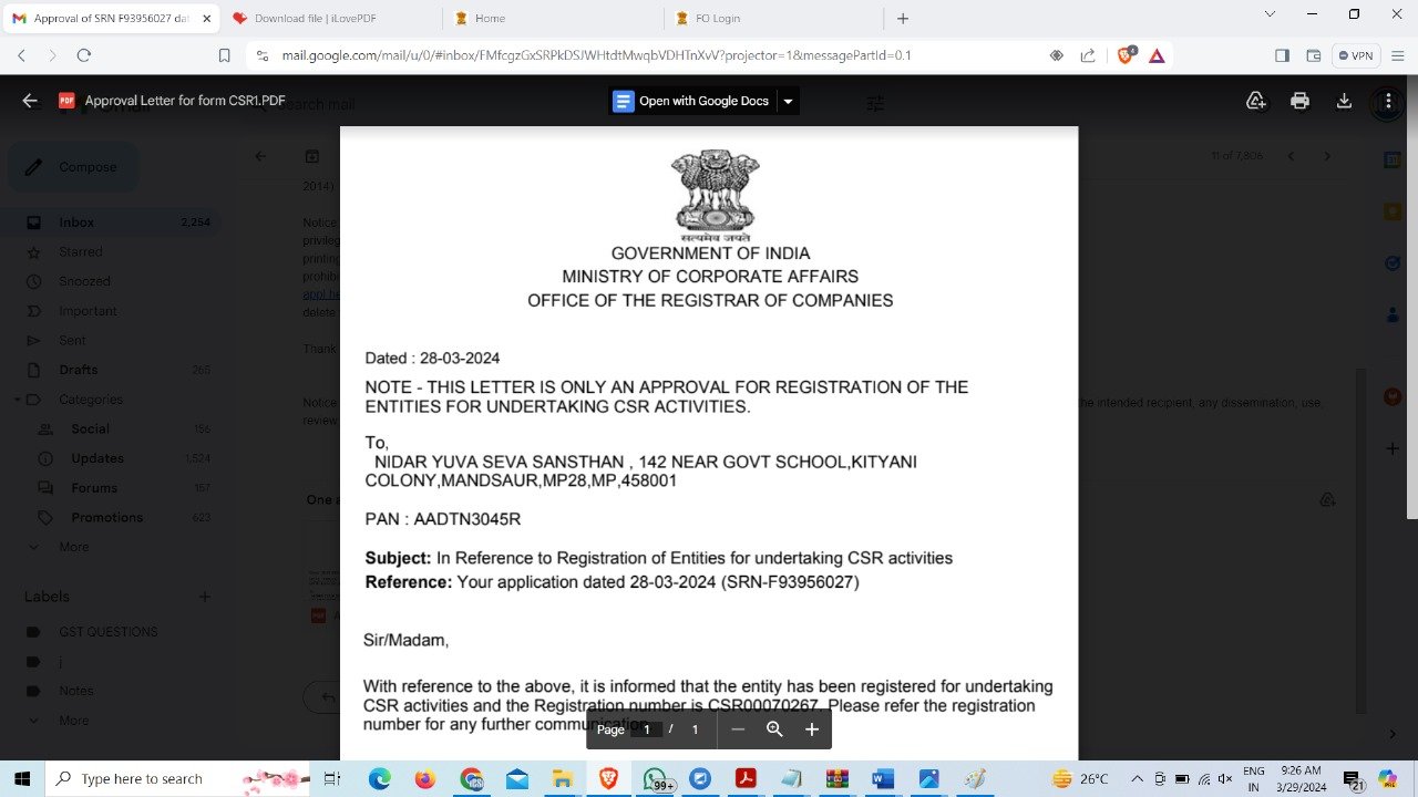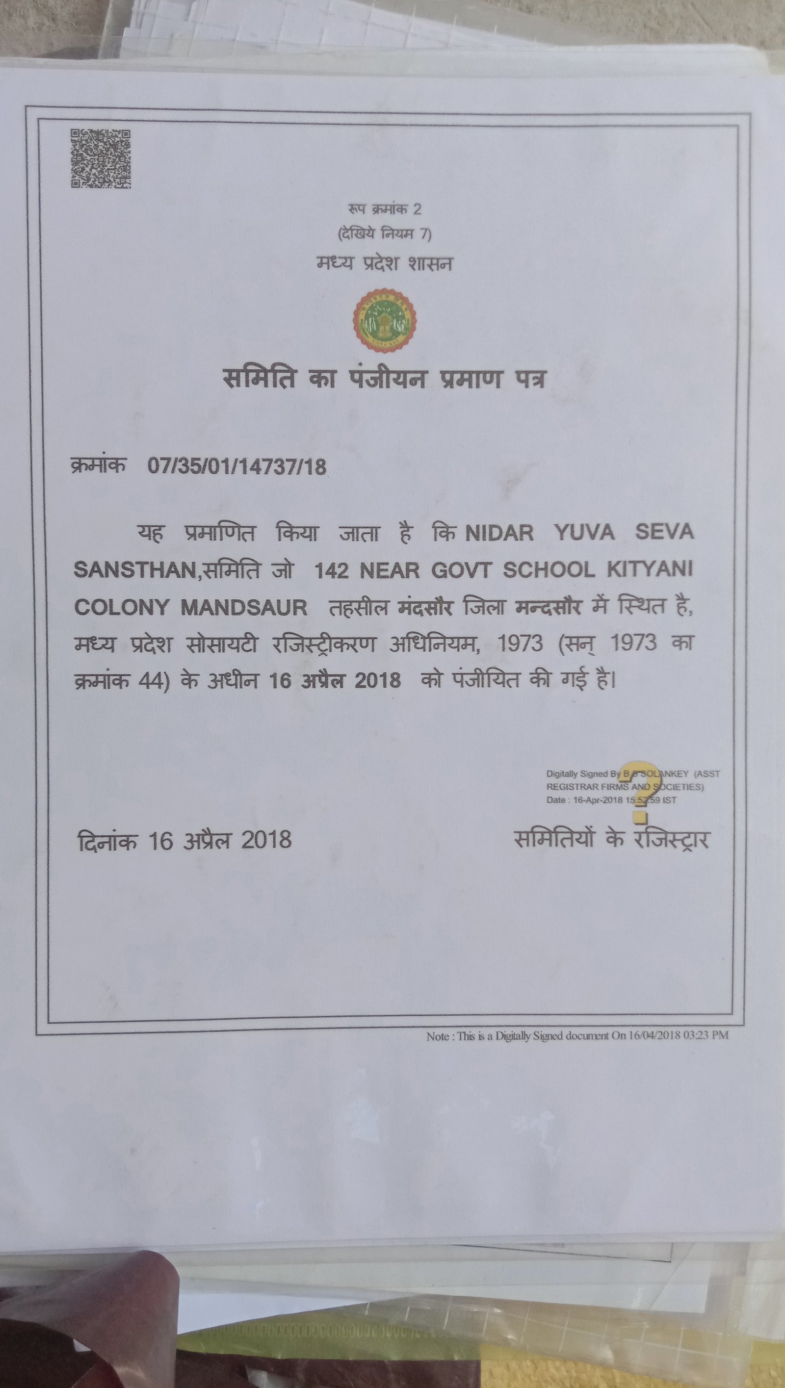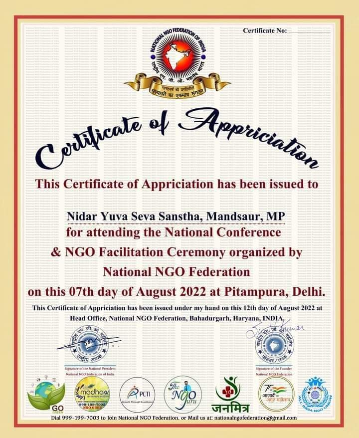 Name of the organization Nidar Yuva Seva Sanstha Mandsaur Madhya Pradesh