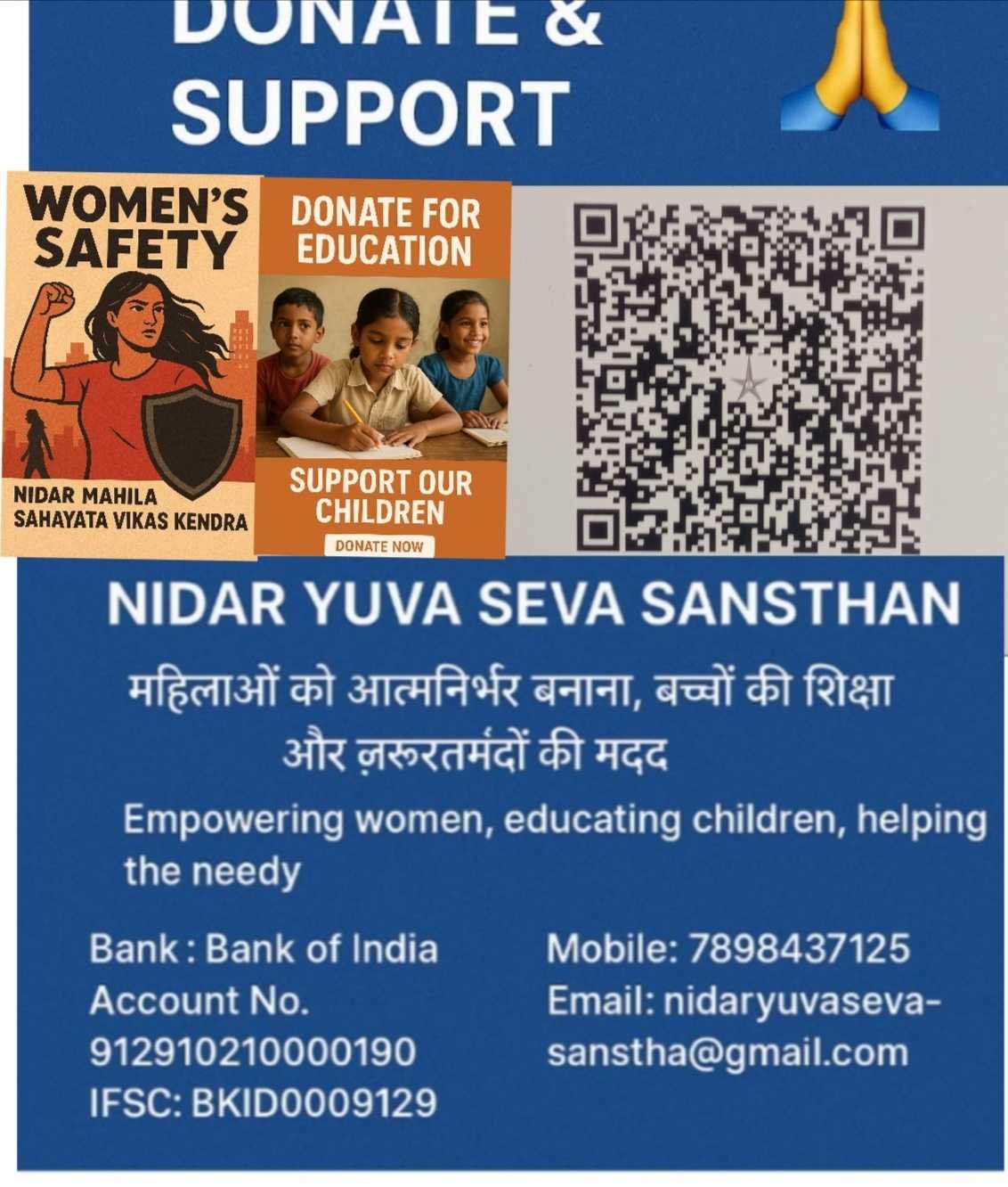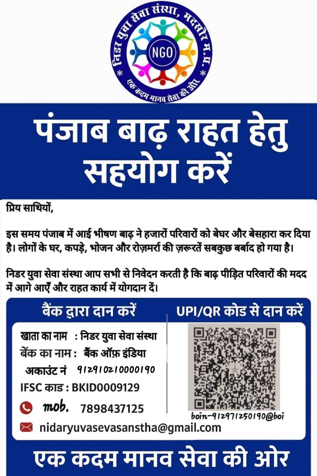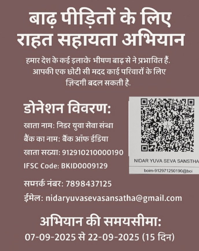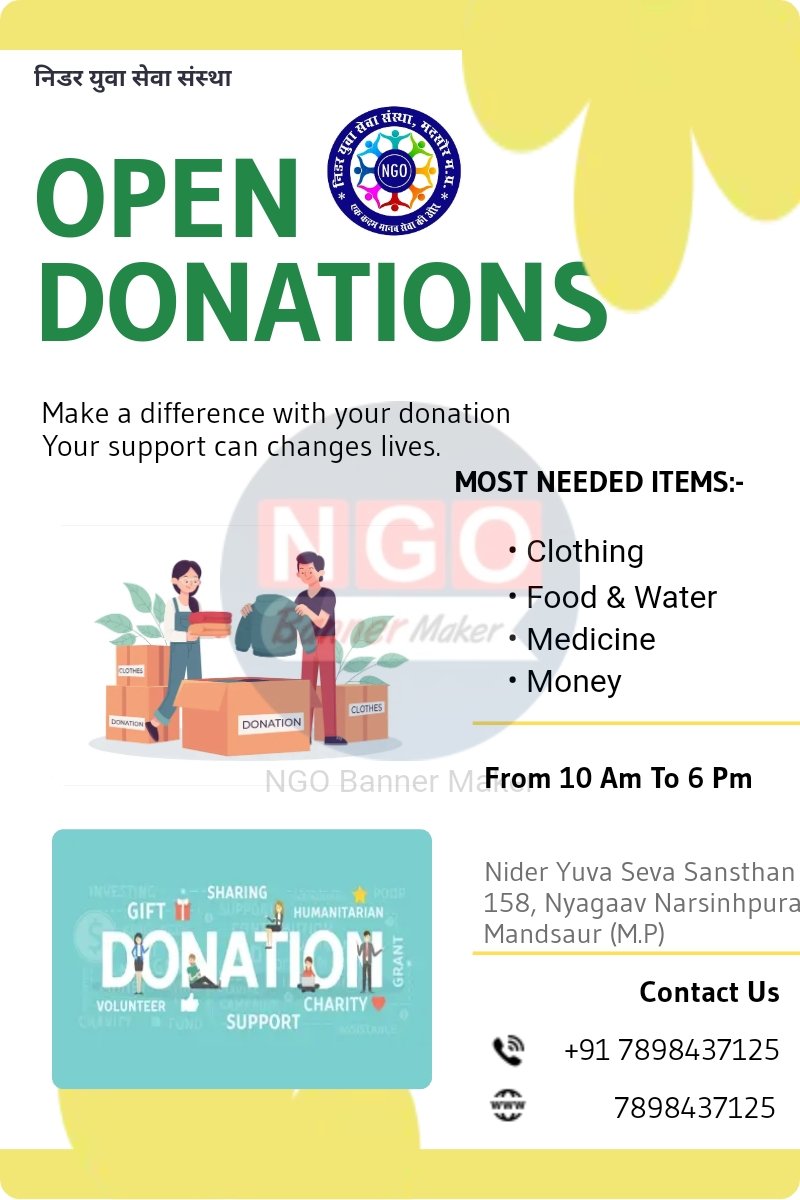 निडर युवा सेवा संस्था की ओर से आप सभी को रमजान माह की मुबारकबाद! रमजान का महीना हमें सहानुभूति, दया और दान की महत्ता को समझाता है। इस पवित्र महीने में, हम निडर युवा सेवा संस्था की ओर से आप सभी से अपील करते हैं कि आप हमारी संस्था को डोनेशन देकर गरीब और जरूरतमंद लोगों की मदद करने में सहयोग करें। हमारा उद्देश्य हमारी संस्था का उद्देश्य गरीब और जरूरतमंद लोगों की मदद करना है, जो रोजमर्रा की जिंदगी में संघर्ष कर रहे हैं। हमारी संस्था की ओर से हम गरीबों को भोजन, पानी, कपड़े, और अन्य आवश्यक सामग्री प्रदान करते हैं। आपका सहयोग आपका सहयोग हमें गरीब और जरूरतमंद लोगों की मदद करने में बहुत बड़ा योगदान देगा। आपके दान से हम गरीबों को सहायता प्रदान कर सकते हैं और उनकी जिंदगी में सकारात्मक परिवर्तन ला सकते हैं। डोनेशन के तरीके आप हमें डोनेशन देने के लिए निम्नलिखित तरीकों का उपयोग कर सकते हैं: - ऑनलाइन डोनेशन: आप हमारी वेबसाइटhttps://nyssngo.org पर जाकर ऑनलाइन डोनेशन दे सकते हैं। - चेक/डिमांड ड्राफ्ट: आप हमें चेक/डिमांड ड्राफ्ट के माध्यम से डोनेशन दे सकते हैं। - नकद डोनेशन: आप हमें नकद डोनेशन दे सकते हैं। संपर्क जानकारी आप हमसे संपर्क करने के लिए निम्नलिखित जानकारी का उपयोग कर सकते हैं: - फोन नंबर: [7898437125] - ईमेल पता: [nideryuvasevasansthan@gmail.com] - धन्यवाद हम आपके सहयोग के लिए धन्यवाद देते हैं। आपका सहयोग हमें गरीब और जरूरतमंद लोगों की मदद करने में बहुत बड़ा योगदान देगा। निडर युवा सेवा संस्था की ओर से, [शहजाद हुसैन]